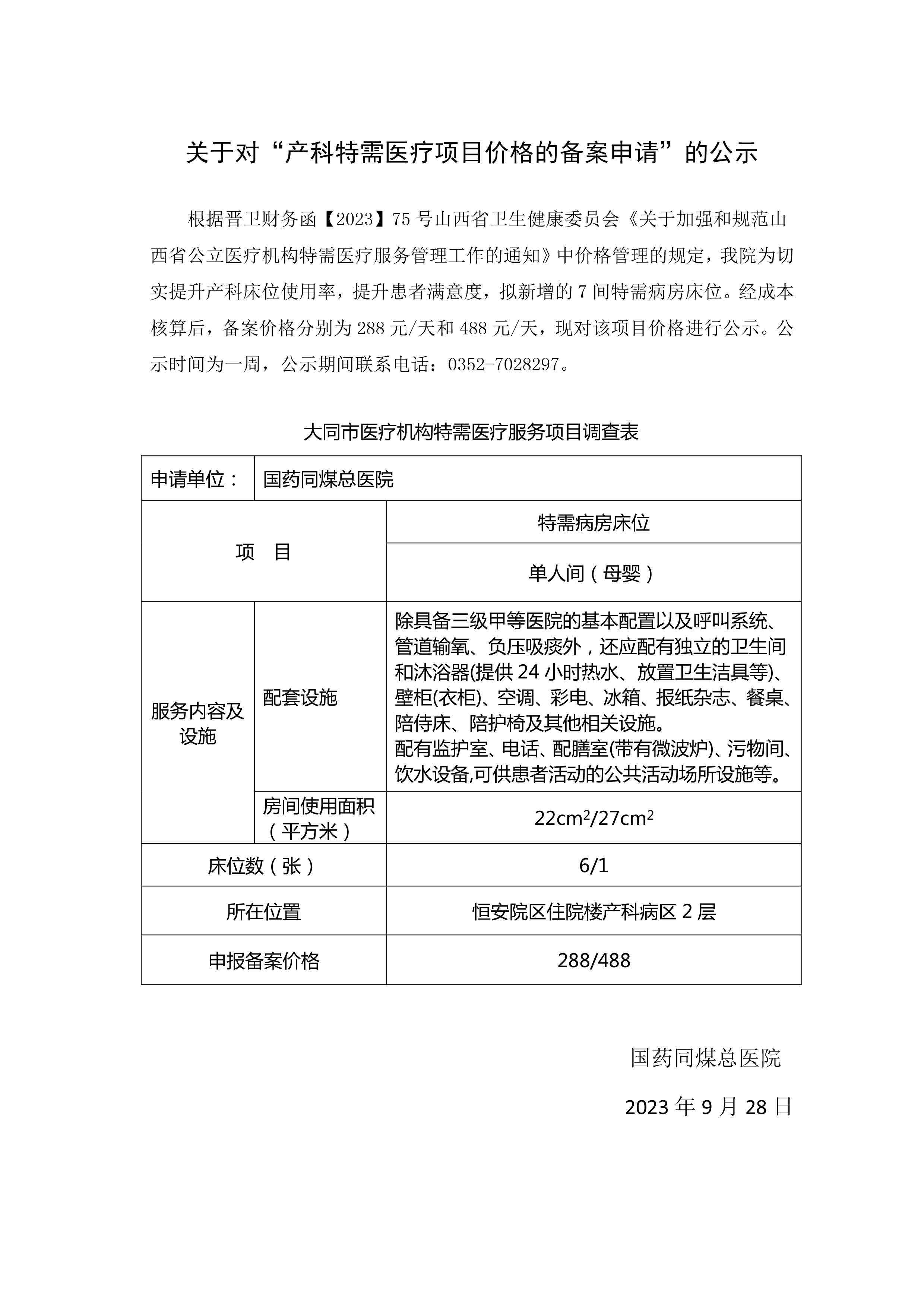 关于对“产科特需医疗项目价格的备案申请”的公示