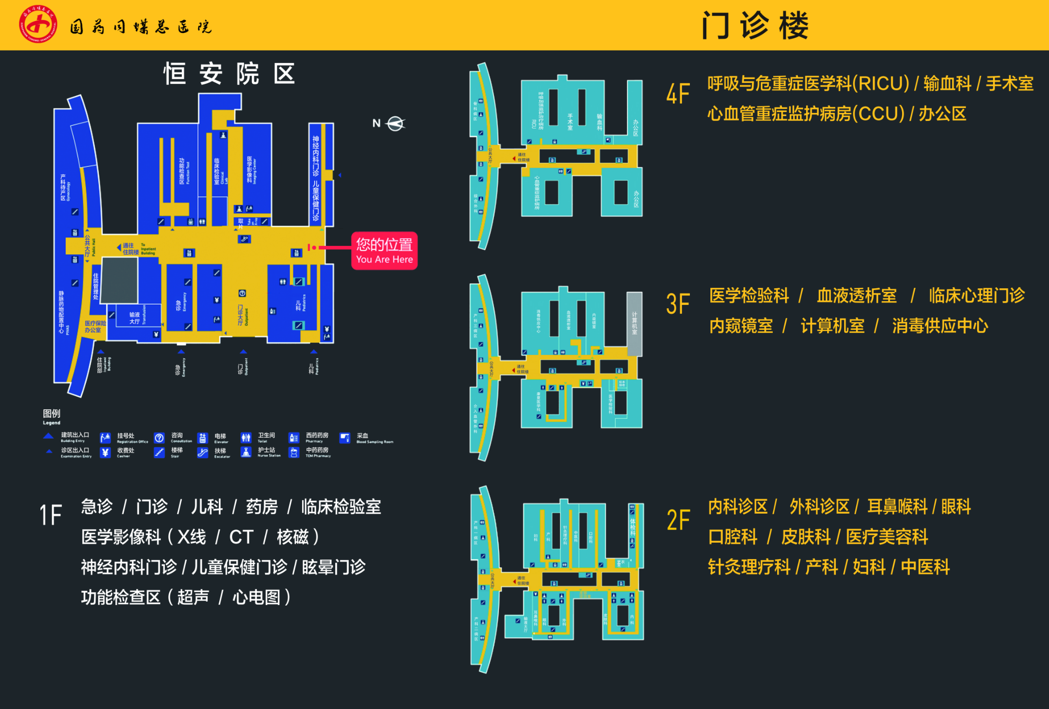 西药房、影像科(放射科、核磁、CT室、增强CT室)、急诊科、急诊收费、急诊液疗中心、化验室(采血区)